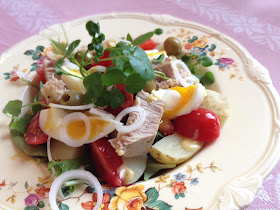 Salat Nicoise findes i mange varianter med fælles er vidst, at den indeholder tunfisk, æg, kolde kartofler og oliven.